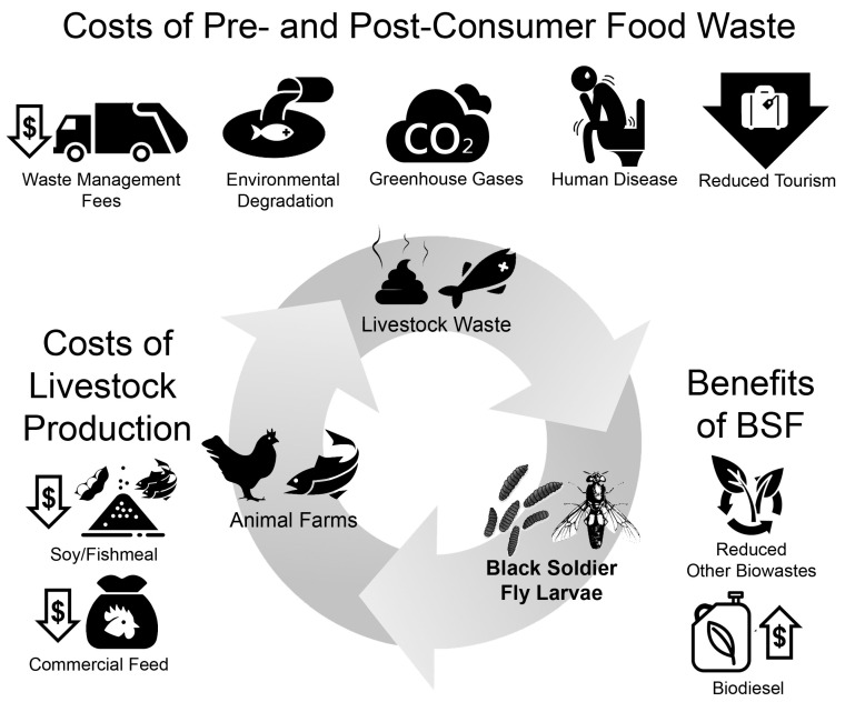 BSF larvae have the ability to convert food and animal waste into protein. They can be fed livestock manure throughout their growth process, and then be fed to those same livestock once they are harvested. They are a high source of protein, comparable with traditional soybean or fish meal. This circular model decreases input costs for farmers and reduces waste. BSF frass can also be used as fertilizer, which also reduces input costs.